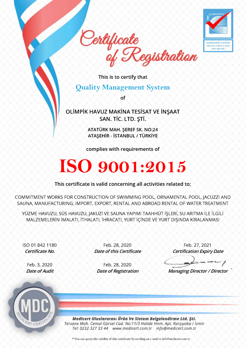 Our company provides services of construction, manufacturing and consulting for all kind of swimming pool, ornamental & decorative pool, massage pool & jaccuzzi, fountain, water plays, sauna, steam room projects and SPA. All parts of project; such as construction, filtration, mechanical work , electromechanical work, are in our work range. We are continuing our business with applying high tech, safe & smooth solutions for more than 30 years, having proud of more than 650 completed projects worldwide.